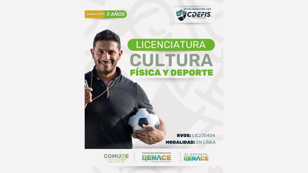 Si te apasiona el deporte y sueñas con convertirlo en tu profesión, esta es tu oportunidad. El Consejo Municipal del Deporte de Puerto Vallarta, en colaboración con la Universidad CDEFIS, abrió la convocatoria para estudiar la Licenciatura en Cultura Física y Deporte a través del programa universitario RENACE. Con validez oficial (RVOE: LIC230404), este programa tiene una duración de tres años, modalidad en línea y clases sabatinas de 9:00 a 13:00 horas.
