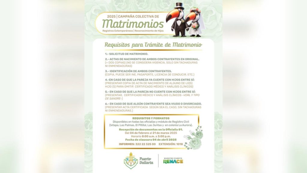 Puerto Vallarta se prepara para celebrar la primera campaña de matrimonios colectivos del año, Registros Extemporáneos y Reconocimiento de Hijos, gracias al apoyo del gobierno de Luis Munguía en donde se espera la unión de cerca de 100 parejas el próximo 4 de abril.