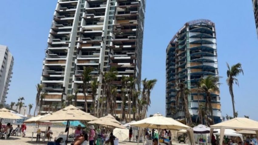 Desde la playa semillena se observan las estructuras sin paredes, ventanas ni puertas de los condominios y hoteles donde las ráfagas de viento de Otis impactaron de manera directa. También hay escombro de palmeras, concreto y plafón. Lo mismo con los anuncios espectaculares: algunos lucen sus esqueletos y otros totalmente doblados.