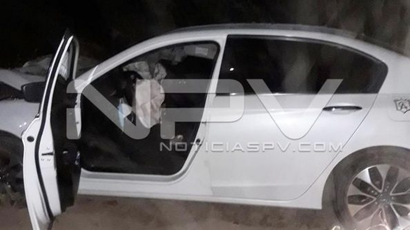 A 100 metros rumbo al poblado de Tecuala, dentro de una tierra de cultivo, encontraron un vehículo abandonado este de la marca Honda, Tipo Accord, de color blanco, con placas de circulación JMY- 21-54 del Estado de Jalisco, mismo que estaba chocado de su parte frontal delantera.