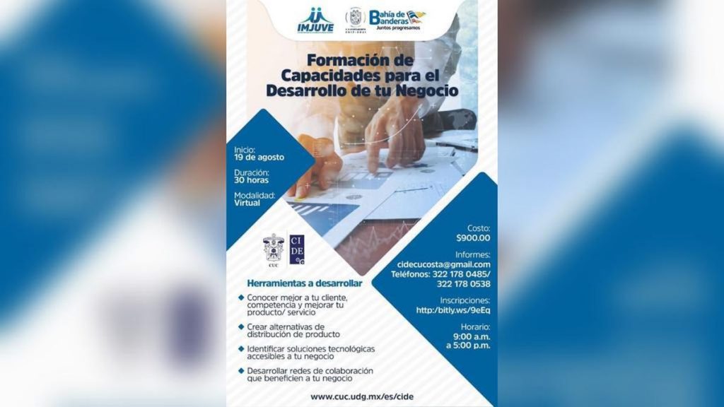 Con el objetivo de seguir impulsando la reactivación económica de nuestro municipio y que comerciantes y emprendedores cuenten con herramientas que adecuen sus servicios a la nueva normalidad por el COVID-19, el Gobierno Municipal de Bahía de Banderas que encabeza el doctor Jaime Cuevas Tello, invita al curso “Formación de Capacidades para el Desarrollo de tu Negocio”, el cual se desarrollará en coordinación con el Centro Universitario de la Costa (CUC).