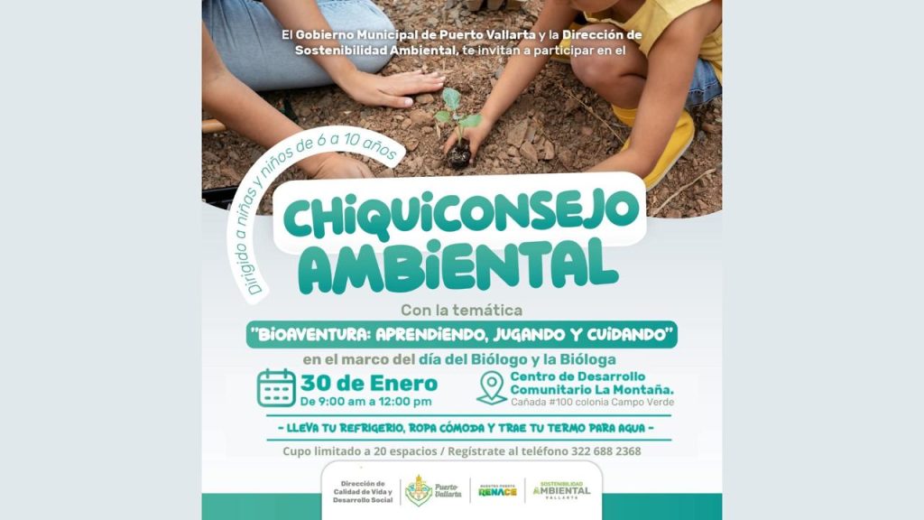 Con el objetivo de integrar a las nuevas generaciones en la preservación del entorno natural, el Gobierno Municipal de Puerto Vallarta invita al taller «Chiquiconsejo Ambiental». La edición de este año, denominada Bioaventura, permitirá que los pequeños aprendan la importancia de la biología y el cuidado del ecosistema a través de actividades recreativas.
