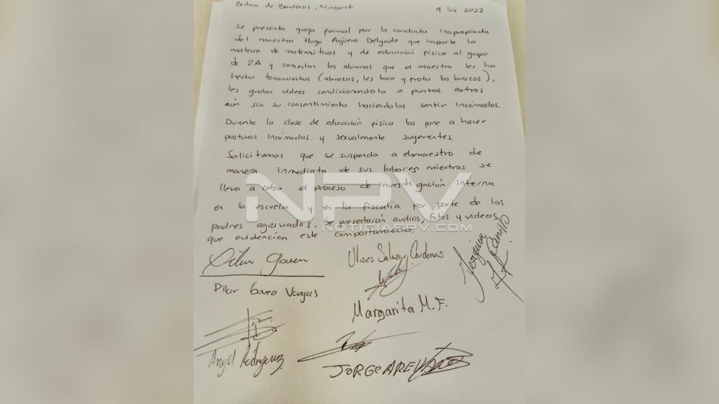 “De una situación que hay en la secundaria de Valle Dorado en el municipio de Bahía de Banderas en Nayarit, buenos días, terminando la junta del día de hoy se redactó queja formal y se invita a los padres de familia a pasar a firmar a quien guste apoyar en la solicitud de la suspensión inmediata del maestro de sus labores ya que mientras más firmas más contundente es la queja. Pasaremos a fiscalía a presentar queja ante las autoridades con esta hoja firmada de recibido por parte de la escuela”.