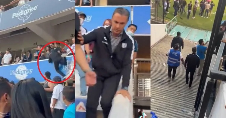 En un video que se difundió en redes sociales, se puede ver el momento en el que el exfutbolista se bajó de uno de los palcos, saltando la barandilla, para entrar en las gradas y caminar hacia el terreno de juego del estadio La Corregidora.