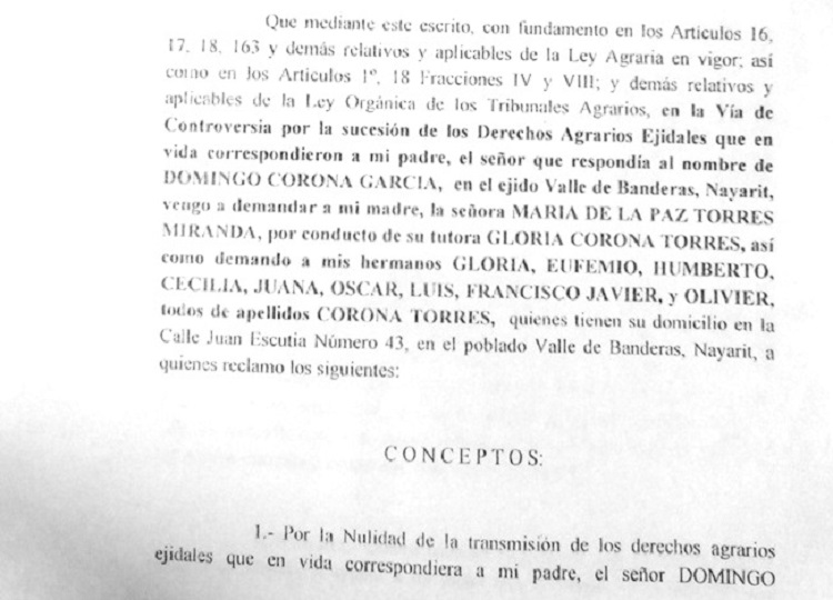Con fecha 4 de septiembre 2017, Arturo Corona Torres, sucesor número dos de la lista de sucesión que su padre, Domingo Corona, QEPD, ejidatario de Valle de Banderas, Bahía de Banderas, Nayarit, inscribió en el Registro Agrario Nacional, bajo el expediente 650/2017, inicio un juicio agrario donde demanda la nulidad de Derechos Ejidales y nulidad de lista de sucesión dejada en forma de testamento agrario, esto debido a que desde antes de que falleciera su padre y posterior a ello, sus hermanos, según narra, Arturo Corona, realizaron trámites indebidos para cambiar la lista de sucesión en razón de que al fallecer su padre, en la lista de sucesión su madre era la número uno, pero desde antes del fallecimiento de su padre, su señora madre estaba discapacitada, motivo por el cual, en automático, dichos derechos agrarios le correspondían a él, según la voluntad de su padre que fue debidamente inscrita en el Registro Agrario Nacional en tiempo y forma.