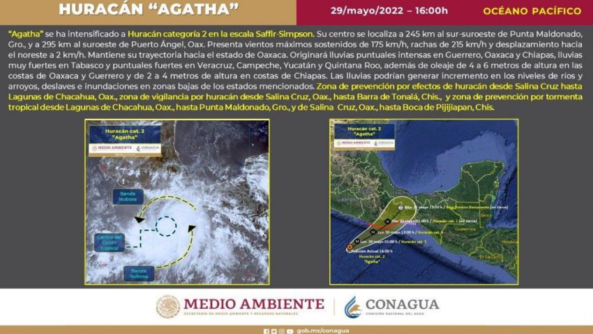 Comunicado | A las 16:00 horas, tiempo del centro de México, el huracán Agatha se ha intensificado a categoría 2 en la escala Saffir-Simpson, registró vientos máximos sostenidos de 175 kilómetros por hora (km/h), rachas de 215 km/h y desplazamiento hacia el noreste a 2 km/h; su centro se localizó aproximadamente a 245 kilómetros (km) al sur-suroeste de Punta Maldonado, Guerrero, y a 295 km al suroeste de Puerto Ángel, Oaxaca.