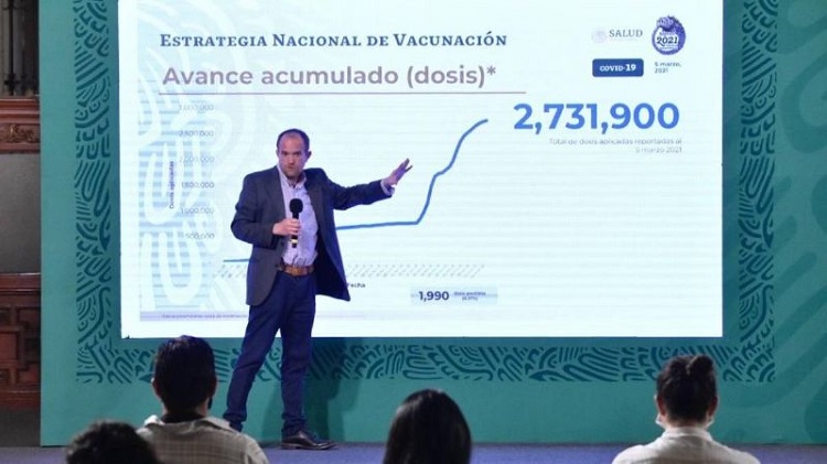 “El total de dosis recibidas en la Estrategia Nacional de Vacunación, se han recibido 4 millones 691 mil 775 dosis de cuatro opciones de vacuna: 2 millones 621 mil 775 de la de Pfizer y BioNTech; 870 mil de AstraZeneca; 1 millón de SinoVac y 200 mil de Sputnik V”, comentó en la conferencia de prensa vespertina sobre covid-19 en el país.