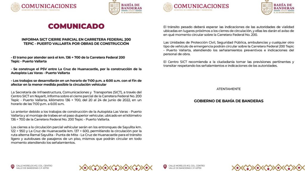 Comunicado | La presidenta municipal de Bahía de Banderas informó que debido a la construcción de la Autopista Las Varas-Puerto Vallarta, del 20 al 24 de junio la carretera federal 200 tendrá un el cierre parcial en ambos sentidos en el kilómetro 136-700, en un horario de 7 de la noche a las 6 de la mañana (hora centro).