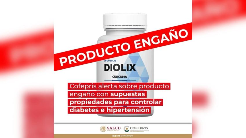 Tiene por nombre comercial Diolix y carece de registro sanitario. Son cápsulas que se anuncian como tratamiento para el control de los niveles de glucosa y de presión arterial, entre otros beneficios no verificados científicamente, señaló la agencia.