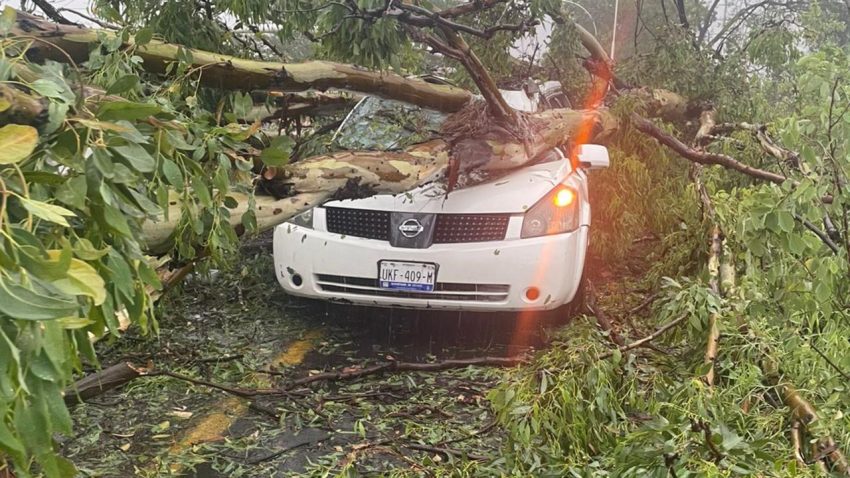 Sobre el libramiento cayeron enormes árboles encima de autos en circulación. Algunos vehículos quedaron atrapados en las calles inundadas. Se activó el personal de Gobierno del Estado