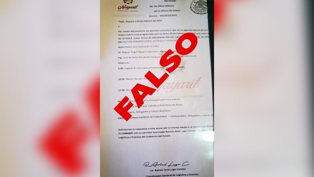 Tepic, Nayarit; viernes 3 de febrero de 2023.- Derivado de una denuncia presentada este día ante el Agente del Ministerio Público adscrito a la Unidad de Atención Temprana de Fiscalía General del Estado, por parte del C. Ramón Ariel Lugo Corrales, Coordinador General de Logística y Eventos de Gobierno del estado de Nayarit, en el sentido que diversas autoridades municipales de la entidad han sido requeridas de información a su nombre -utilizando para ello hojas oficiales membretadas-, con el supuesto fin de coordinar giras del titular del Poder Ejecutivo estatal por diferentes municipalidades, se hace un atento llamado a la ciudadanía y sobre todo a los presidentes municipales y alcaldesas de Nayarit para no hacer caso de tales falsos requerimientos y denunciar los hechos ante las autoridades correspondientes.