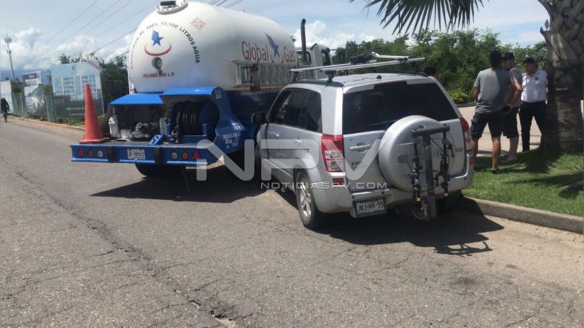 Oficiales de vialidad municipal de Bahía de Banderas, atendieron fuerte accidente vehicular ocurrido sobre el Boulevard Riviera Nayarit a la altura de los semáforos del Decameron en Bucerías, en donde se vieron involucrados un vehículo compacto y una pipa de gas.
