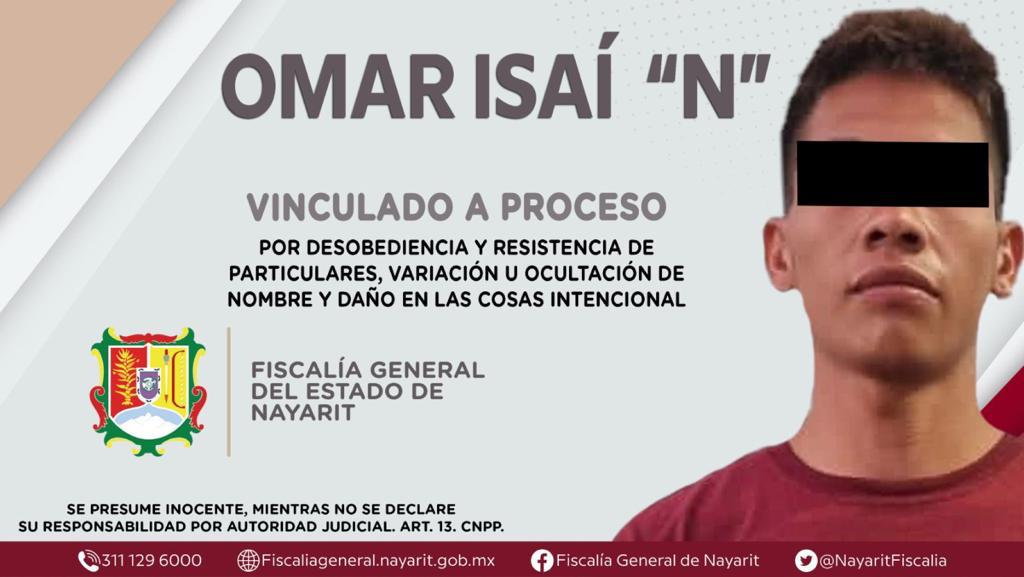 Comunicado.- La Fiscalía General del Estado a través de la agencia del Ministerio Público de Bahía de Banderas obtuvo de un Juez de Control vinculación a proceso de Omar Isaí «N», por su probable participación en hechos que para la ley constituyen los delitos de desobediencia y resistencia de particulares, variación u ocultación de nombre y daño en las cosas intencional.