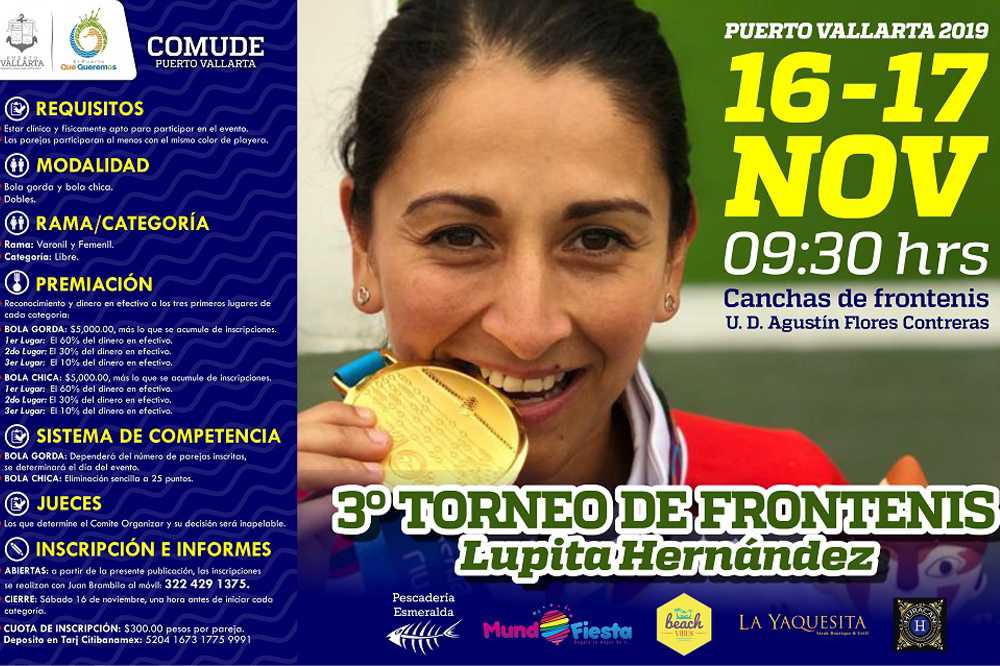 Los días 16 y 17 de noviembre, se llevará a cabo la tercera edición del Torneo de Frontenis en homenaje a la frontenista vallartense Lupita Hernández, campeona en los Juegos Panamericanos de Lima 2019.