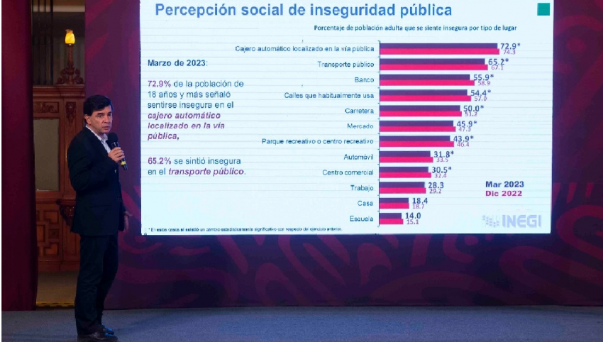 Los sitios donde la gente se siente más insegura son: en primer lugar los cajeros automáticos en la calle, con 72 por ciento; 65 por ciento declaró que en el transporte público; 55 por ciento en los bancos; en las calles 54 por ciento; cinco de cada diez aseveró que percibe inseguridad en las carreteras del país; 45.9 por ciento en los mercados públicos; 43 en un parque o centro recreativo; mientras que los dos sitios con menor índice de percepción de inseguridad son la casa, con 18 por ciento, y la escuela, con 14 por ciento.