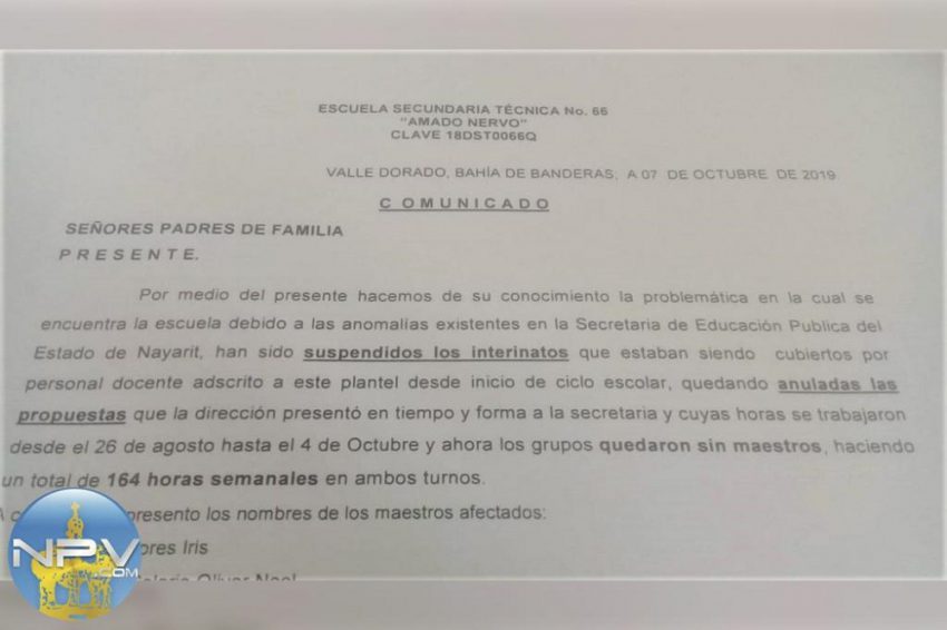 Parece ser que la SEP de Nayarit, obligada por las nuevas reformas educativas, está revisando con lupa a todos aquellos profesores que son contratados para cubrir interinatos del personal docente que imparte clases en las secundarias, en esta caso, la dirección de la Secundaria Amado Nervo de Valle Dorado, Bahía de Banderas, Nayarit, se vieron obligados a informar a los padres de familia que fueron rechazadas sus propuestas de los 18 profesores que cubrían interinatos para impartir clases de diversas materias lo que generó que las clases que impartían se suspendieran de manera inmediata ya que estos profesores estuvieron trabajando desde el inicio de este ciclo escolar 2019/2020 el pasado mes de agosto.