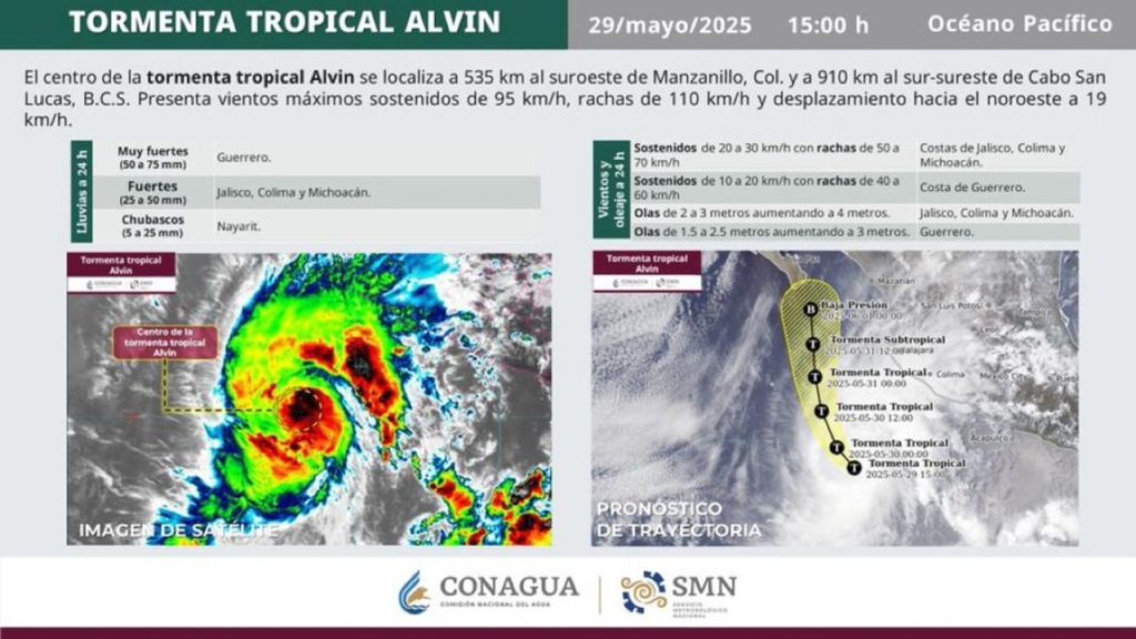 La tormenta tropical Alvin se mantiene activa al sur de las costas de Jalisco y Colima, con un desplazamiento paralelo al litoral del Pacífico central mexicano. Sus bandas nubosas provocan lluvias fuertes a muy fuertes en varios estados del occidente y sur del país, así como vientos intensos y oleaje elevado.