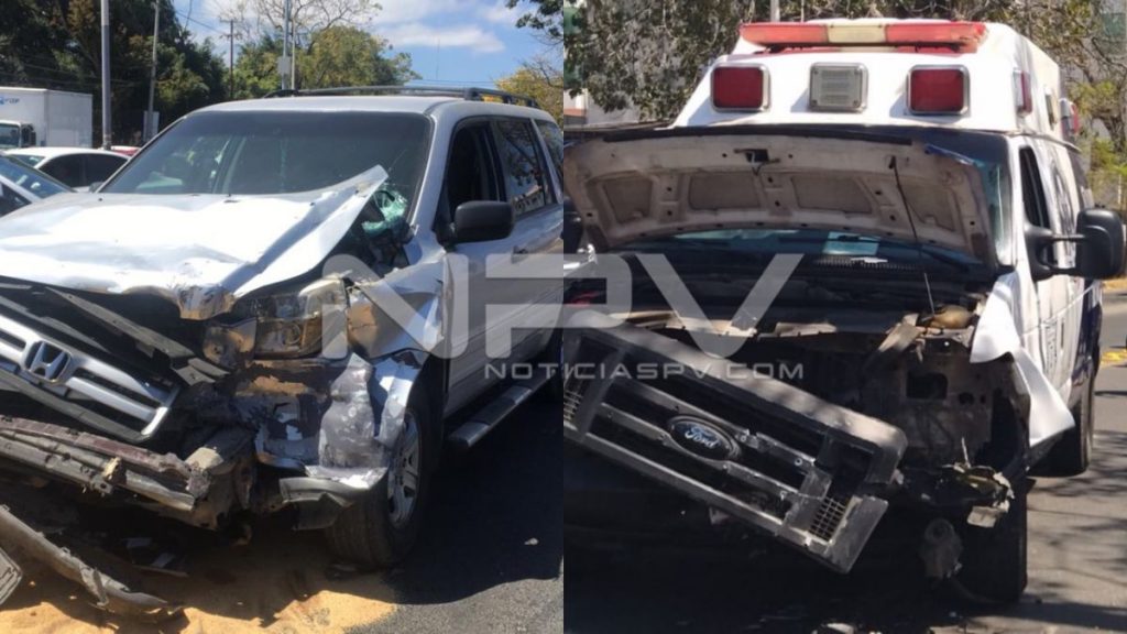 En el lugar encontraron una ambulancia de la Policía Estatal la cual al ir circulando sobre la avenida Insurgentes, al llegar al cruce con Bucerías, se estampó contra una camioneta marca Honda Pilot, en color gris, con placas del Estado de Nayarit.