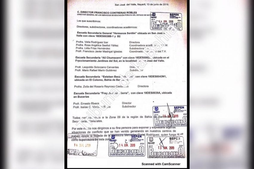 Los directores firmantes de ese oficio donde piden destituyan a la supervisora que también enviaron a su sindicato son de las secundarias generales; Hermanos Serdán y Ali Chumacero de San José del Valle; secundaria Esteban Baca Calderón del Colomo y la Secundaria Fran Junípero Serra de Bucerias.