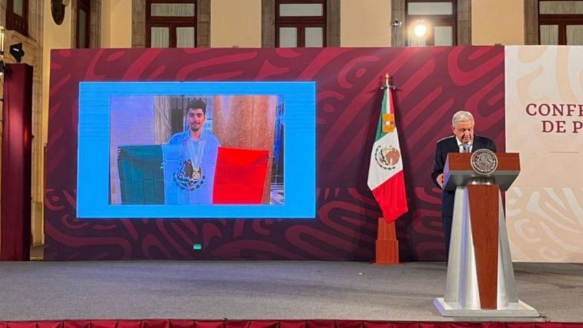 El presidente también felicitó a Rogelio Guerrero, de 17 años, originario de Aguascalientes, quien ganó la medalla de Oro en la Olimpiada Internacional de Matemáticas en Japón el pasado 11 de julio de 2023.