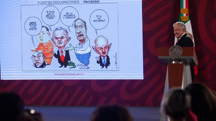 Por ello, exhibió en pantalla una caricatura del monero José Hernández, argumentando que aparecen todos los personajes que ahora resucitaron políticamente hablando y se lanzaron en su contra.
