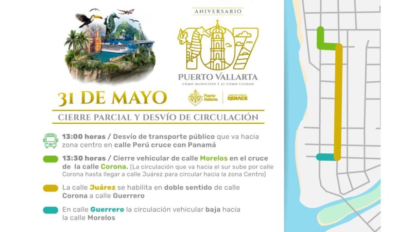 Con motivo del 107 aniversario de Puerto Vallarta como municipio y 57 como ciudad, este 31 de mayo se implementarán cierres parciales y desvíos viales en la zona centro, como parte de los preparativos impulsados por el gobierno del bien que encabeza el alcalde Luis Munguía González.