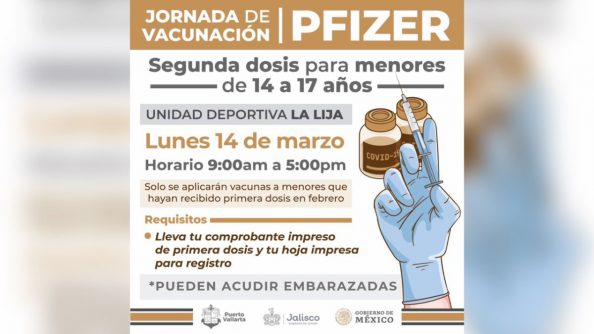 El gobierno municipal de Puerto Vallarta, la Secretaría de Salud Jalisco y la Secretaría de Bienestar, dieron a conocer que este lunes 14 se realizará una jornada de vacunación contra el Covid-19 en este municipio, en esta ocasión la segunda dosis para menores de 14 a 17 años de edad, del biológico Pfizer, del cual se cuenta con 1500 dosis.