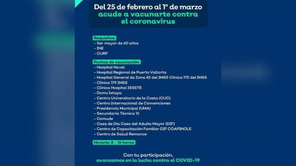 En el caso de Puerto Vallarta la vacunación concluyó a los trabajadores del sector salud y este jueves 25 de febrero 2021, dio arranque la vacunación contra Covid-19 a los adultos mayores, que concluirá el lunes 1 de marzo del 2021.
