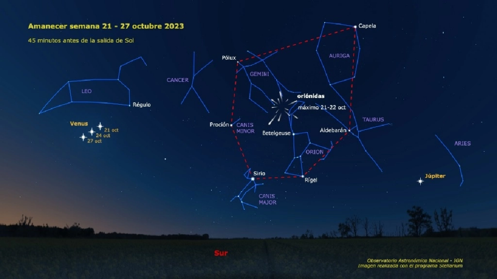 Para observadores a latitudes como las de la España peninsular, 40º norte, el radiante de las Oriónidas se sitúa por encima del horizonte desde la medianoche hasta el amanecer.