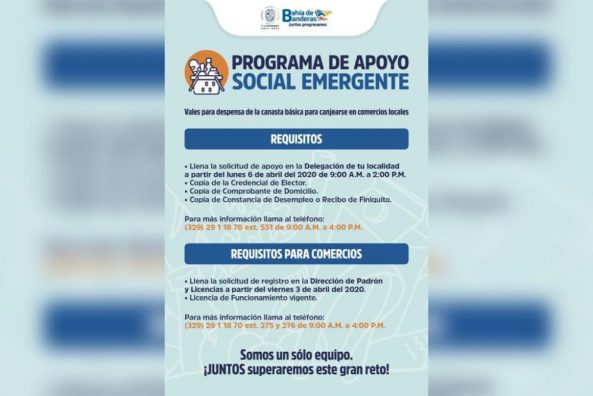 Tal como lo anunció recientemente el Presidente Municipal de Bahía de Banderas, doctor Jaime Cuevas Tello, a partir de este lunes 6 de abril, iniciará la recepción de las solicitudes a personas que perdieron sus fuentes de empleo por la contingencia sanitaria a causa del COVID -19, con lo cual el Ayuntamiento busca garantizar que sus familias puedan tener alimentos y al mismo tiempo fomentar el consumo en el comercio local.