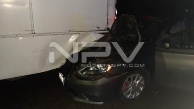 Los agentes viales fueron enterados de que los dos lesionados viajaban momentos antes a bordo de un vehículo Sentra, que fue impactado por alcanse por la parte de atrás por un auto Vento y lo proyectó contra un camión de pasajeros de Transportes Medina, donde quedó incrustado con serios daños materiales.