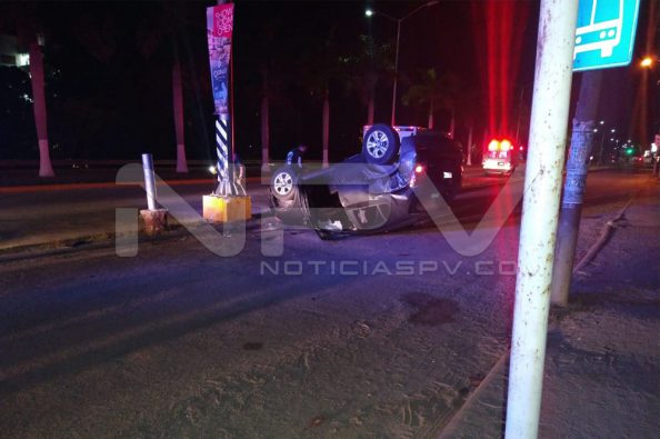 Vecino de Alta Vela volcó en el vehículo que conducía al parecer a exeso de velocidad sobre el Boulevard Riviera Nayarit, quien solo resultó con lesiones que no ponen en riesgo su vida, aunque sí hubo cuantiosos daños materiales.
