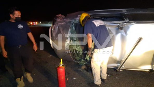 Aparatosa volcadura se registró sobre la carretera que lleva de La Cruz de Huanacaxtle a Punta de Mita, en donde un auto compacto que se quedó sin control, terminó volcado sobre la carretera, resultando dos personas lesionadas.