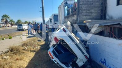 Fue sobre la carretera que lleva a San Juan donde quedó el vehículo volcado y estrellado en la barda del fraccionamiento