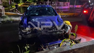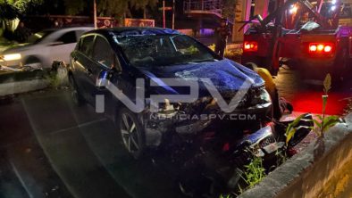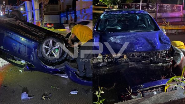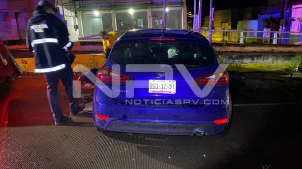 El vehículo es un Kia tipo Forte en color azul con placas de circulación RGU-17-51 del Estado de Nayarit, mismo que terminó volcado y destrozado.