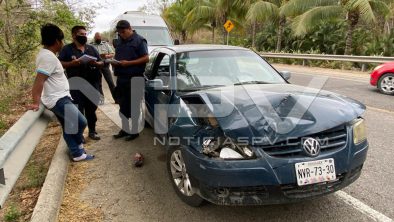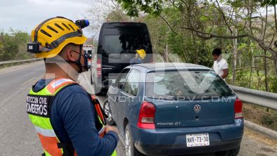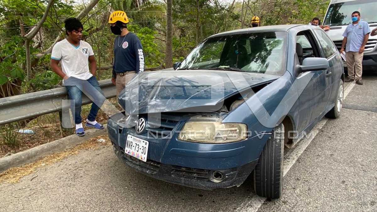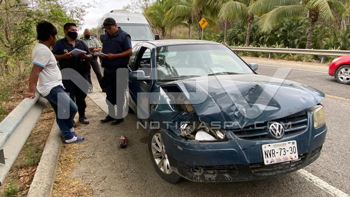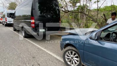 Aparatoso accidente se registró entre dos vehículos por la carretera a Punta de Mita, donde reportaron personas lesionadas que iban a bordo de un auto compacto que chocó por alcance en la parte trasera de una camioneta panel del transporte de Turismo, hasta donde acudieron los Paramédicos de Protección Civil, para auxiliar a los lesionados, pero estos ya se habian retirado por sus propios medios.
