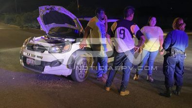 Por el lugar pasaban dos elementos de la Policía Municipal, en una patrulla, quienes al ver el accidente se acercaron a auxiliar a las personas que viajaban en un auto Fiat, de color blanco, quienes manifestaron que fue un vehículo el que se impactó contra ellos y luego se dio a la fuga con rumbo desconocido, sin dar características.