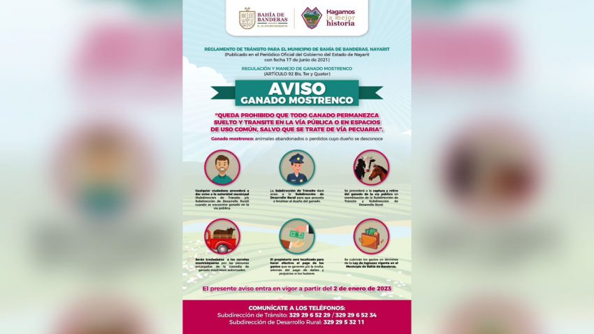 Con el fin de disminuir principalmente accidentes y la contaminación por el ganado que suelto en vía pública, a través de la sub Dirección de Desarrollo Rural junto con la Sub Dirección de Tránsito de Bahía de Banderas, se aplicará el reglamento con multas económicas.