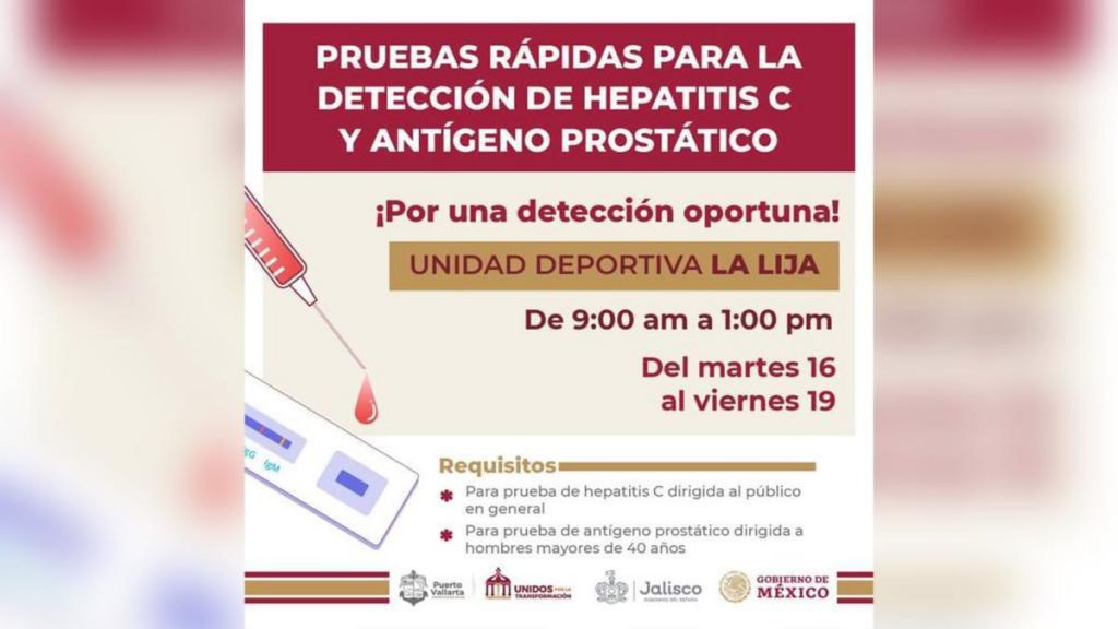 En un esfuerzo conjunto por la salud de los Vallartenses, la 8ª Región Sanitaria y el gobierno municipal que encabeza el alcalde Luis Alberto Michel Rodríguez, llevarán a cabo del 16 al 19 de noviembre, la aplicación gratuita de pruebas rápidas para la detección de Hepatitis C y de antígeno prostático, en las instalaciones del Centro Cultural y Deportivo La Lija, en donde se busca aplicar alrededor de 800 reactivos para detectar a tiempo estas enfermedades y poder brindarles el tratamiento correspondiente.