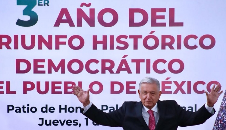 En el patio de honor de Palacio Nacional, celebró su victoria de hace tres años. En una intervención de 39 minutos, ilustró el respaldo que tiene mediante una encuesta del gobierno, que le da una calificación de 6.7 en su desempeño como Presidente de la República. También, dijo, 72.4 por ciento se pronunció porque permanezca en el cargo y 87.4 apoya el cambio que él promueve.