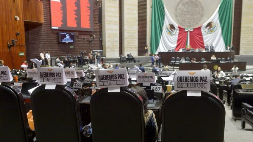 Con una gran lona en el pleno, MC exigió un México con justicia y paz, además, expresó su “rechazo a la militarización” y votó en contra del dictamen.