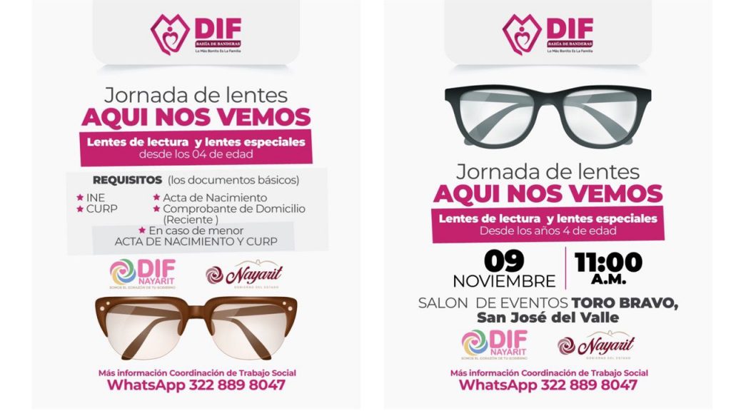 La Jornada de Lentes Aquí nos Vemos, dará inicio a las once de la mañana, en el salón de eventos Toro Bravo de la comunidad de San José del Valle. Para mayores informes los interesados se pueden comunicar al departamento de trabajo social del DIF de Bahía de Banderas a través del WhatsApp 3228898047.