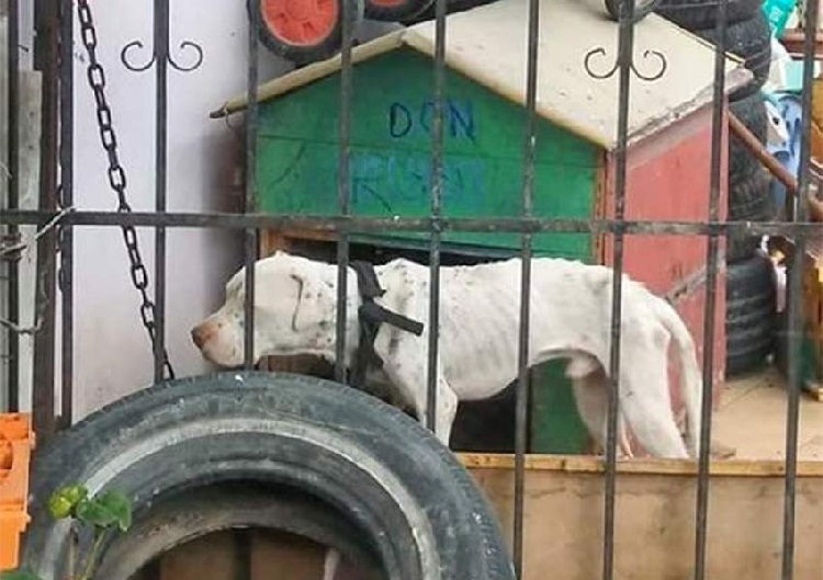 Se aprecia al perro encadenado, con la piel pegada a los huesos y con escaso pelo, en el patio de una casa, entre llantas y cacharros viejos.