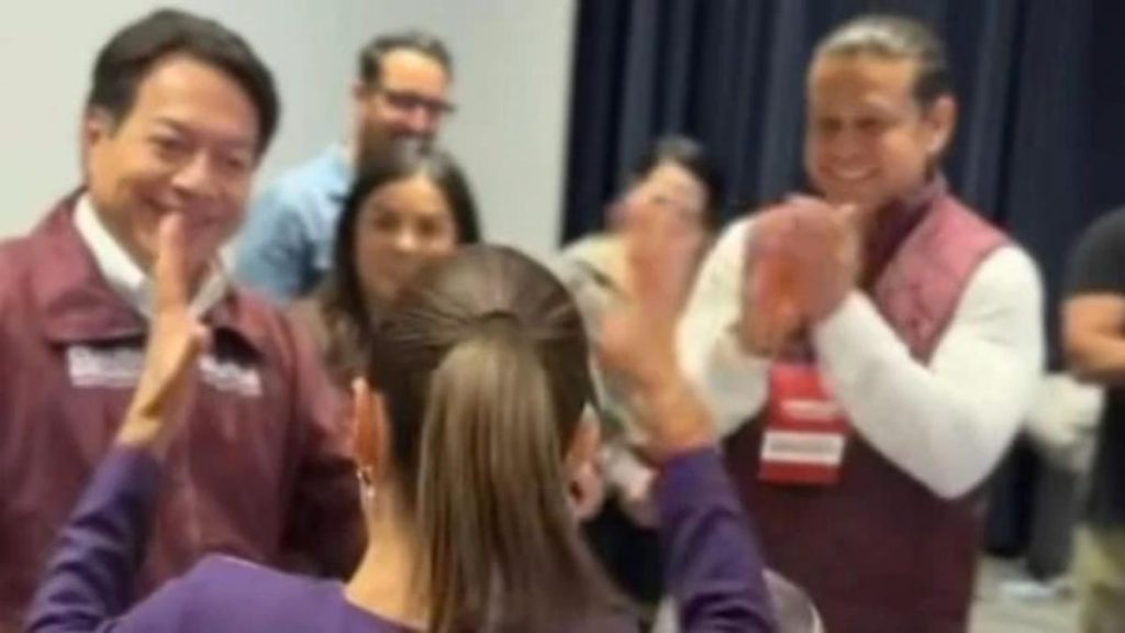 De inmediato, la morenista se levanta de la silla, alza los brazos y los sacude como un gesto de emoción, lanza un grito y abraza al también coordinador general de su campaña presidencial.