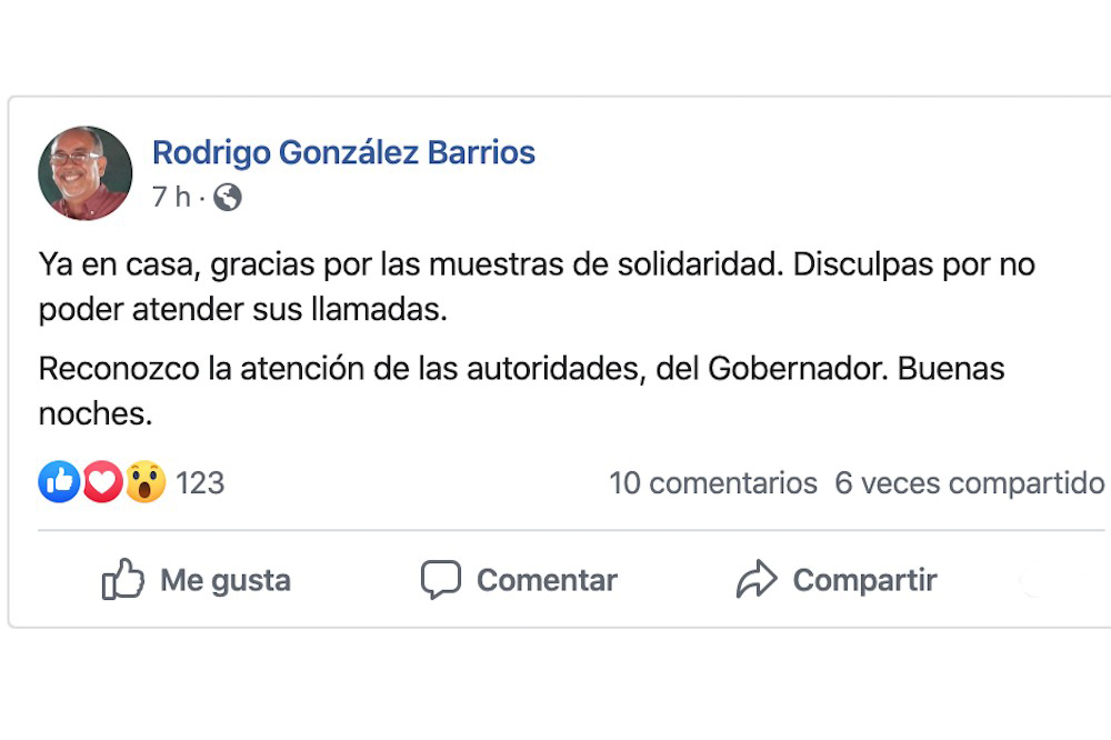 “Tres personas armadas en un camioneta tinta me cerraron el paso, al bajarse el primero y verlo armado con un pasamontañas lo envestí.” expuso mediante su sitio de Facebook.