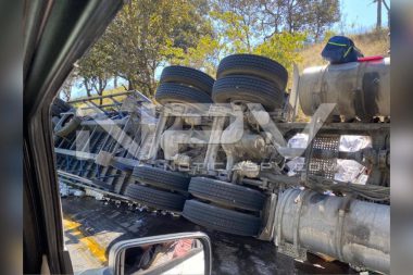 Se volcó trailer cargado de cerveza y cierra parcialmente la carretera 200