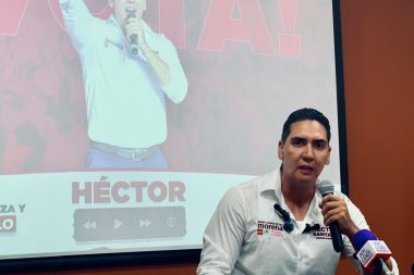 En su última rueda de prensa, el candidato de Morena, Héctor Santana, proyecta un contundente…