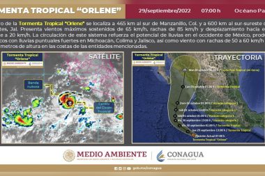 Orlene, categoría 3, presenta vientos máximos sostenidos de 205 km/h, se localizó a 155 km…