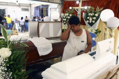 Los tres ataúdes fueron colocados bajo una carpa en una calle en Puerto Bolívar, en…