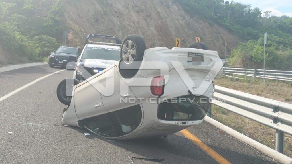 Aparatoso choque y volcadura se registró sobre la salida de la autopista Compostela Bucerías, poco antes de llegar al entronque con el boulevard Riviera Nayarit en Bahía de Banderas.